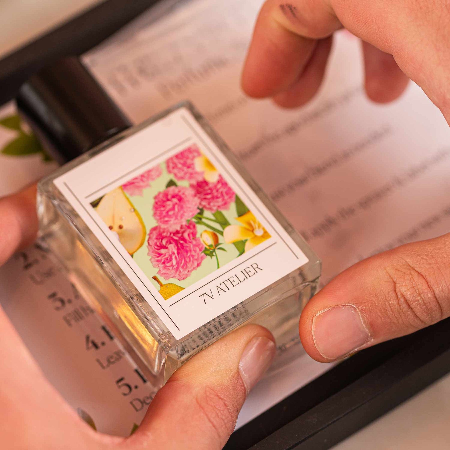 Leave space at the top, then ask an alchemist to apply the sprayer and label with your bespoke perfume name.